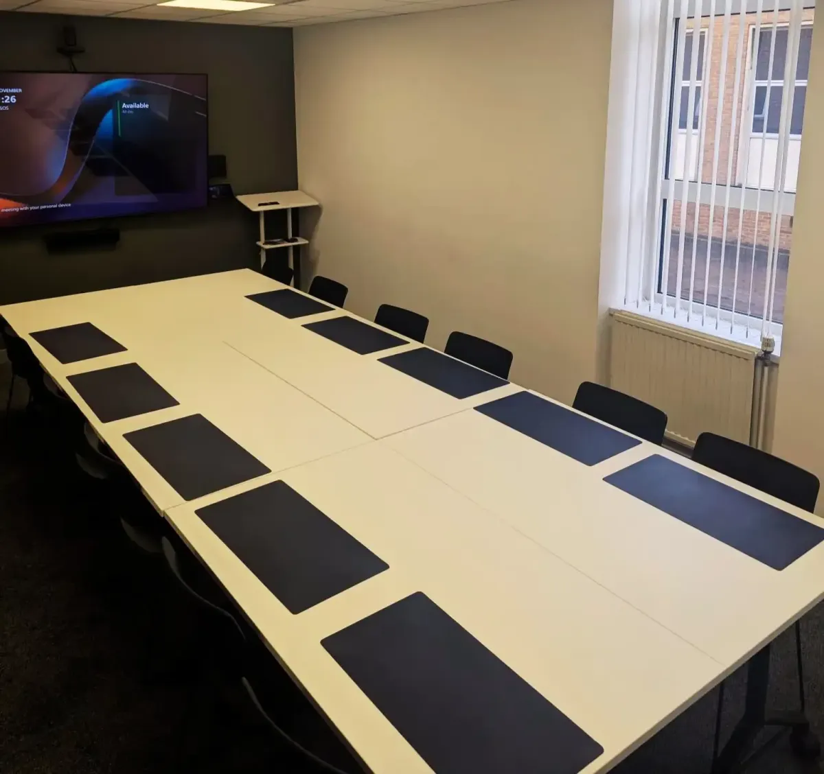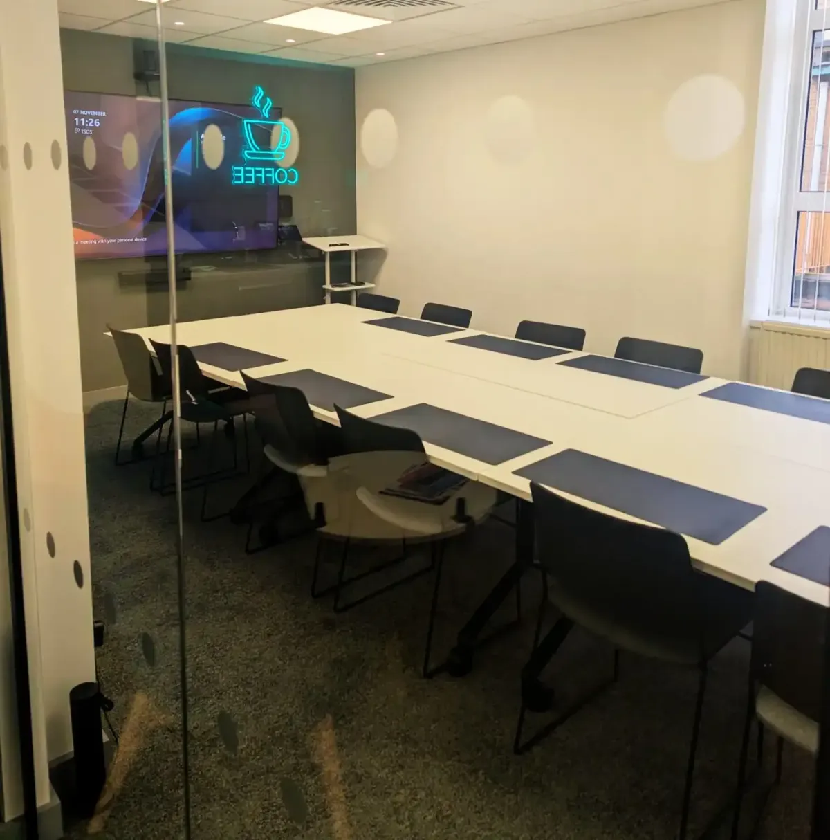 The Tesseract is our largest room able to sit 16 people with access to an 85" TV for presentations, charging facilities and Wi-Fi.
