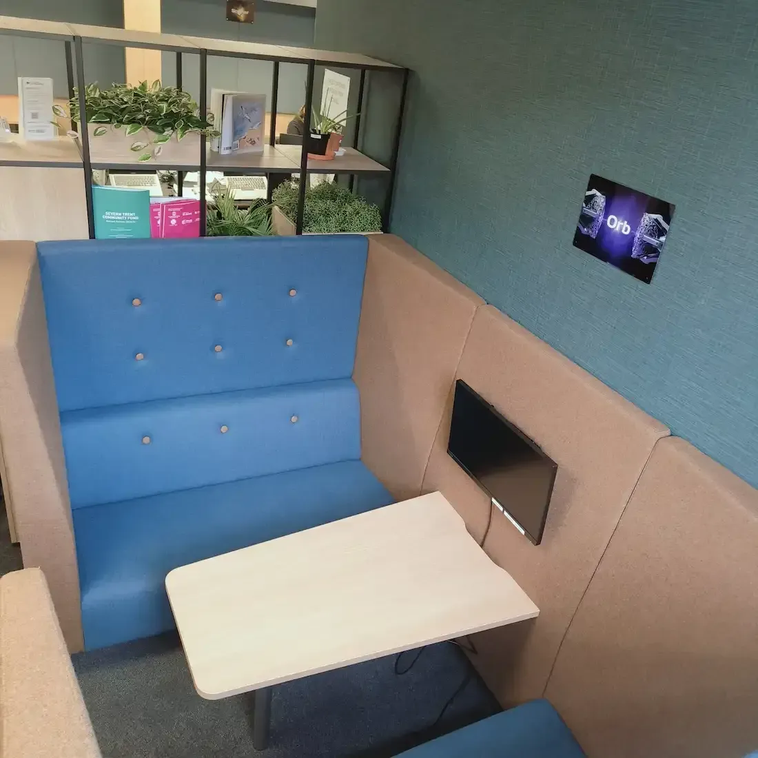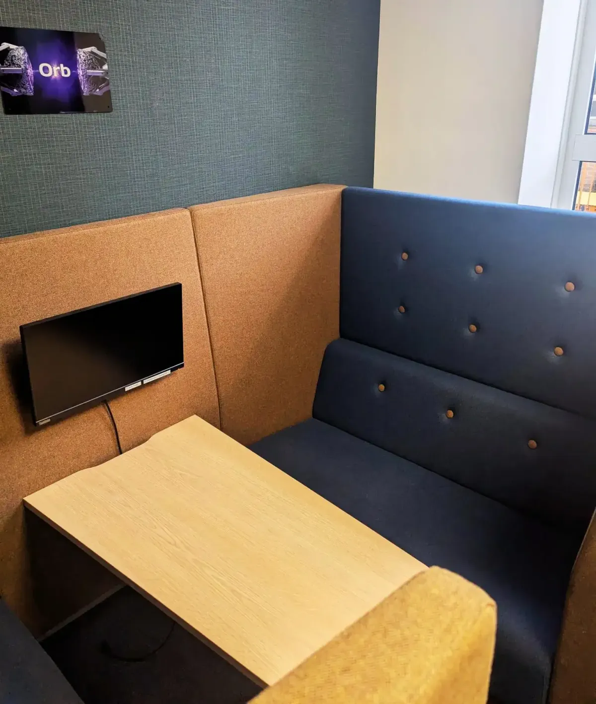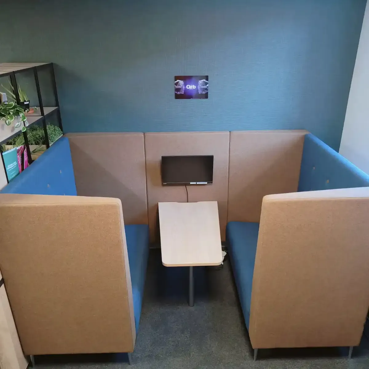 The Orb is the perfect place for small team meetings with space for 4 people. The Orb comes with access to Wi-Fi and an integrated 20" monitor and charging facilities.